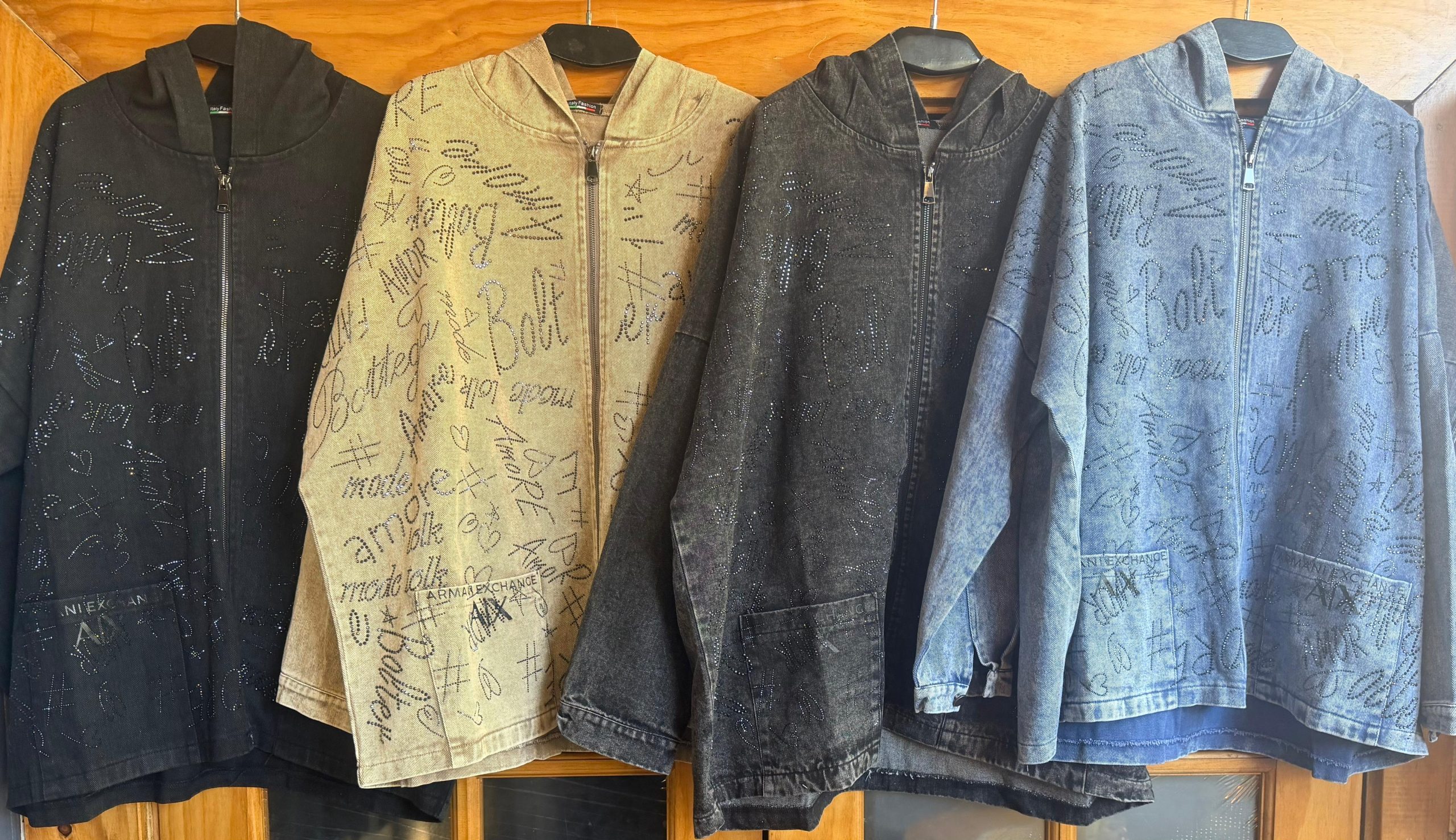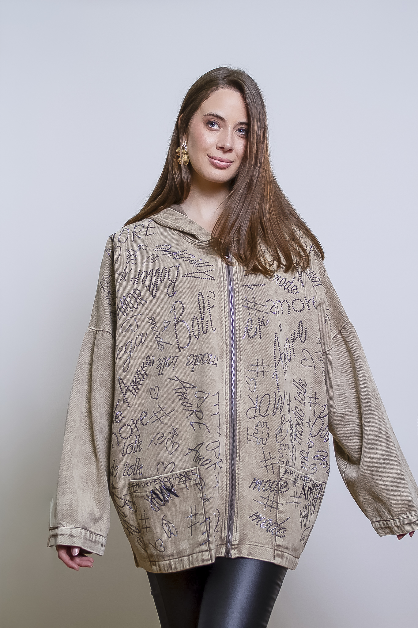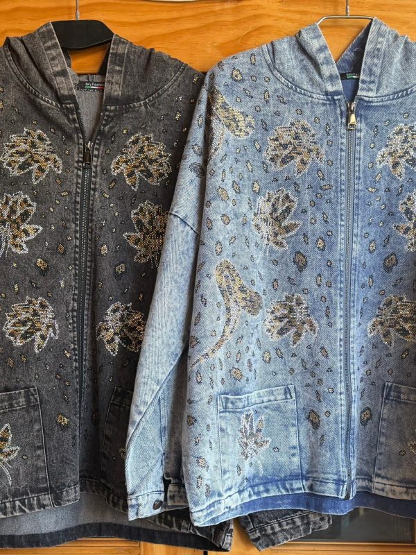 Chaqueta mezclilla con letras en mostacilla brillante