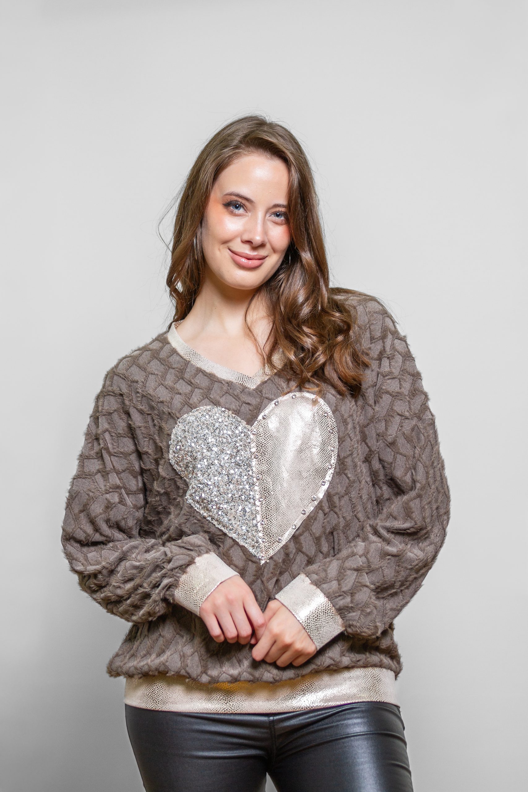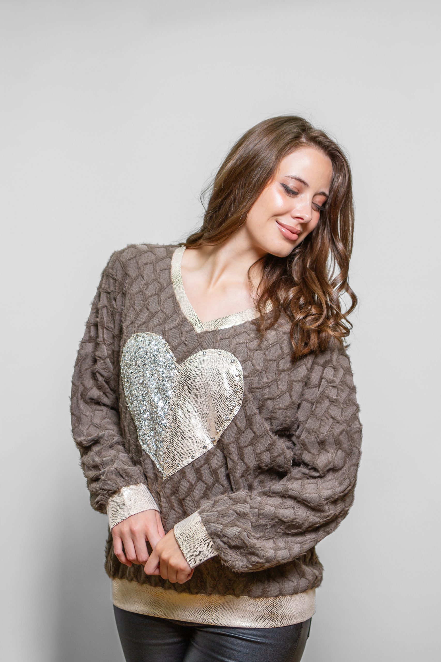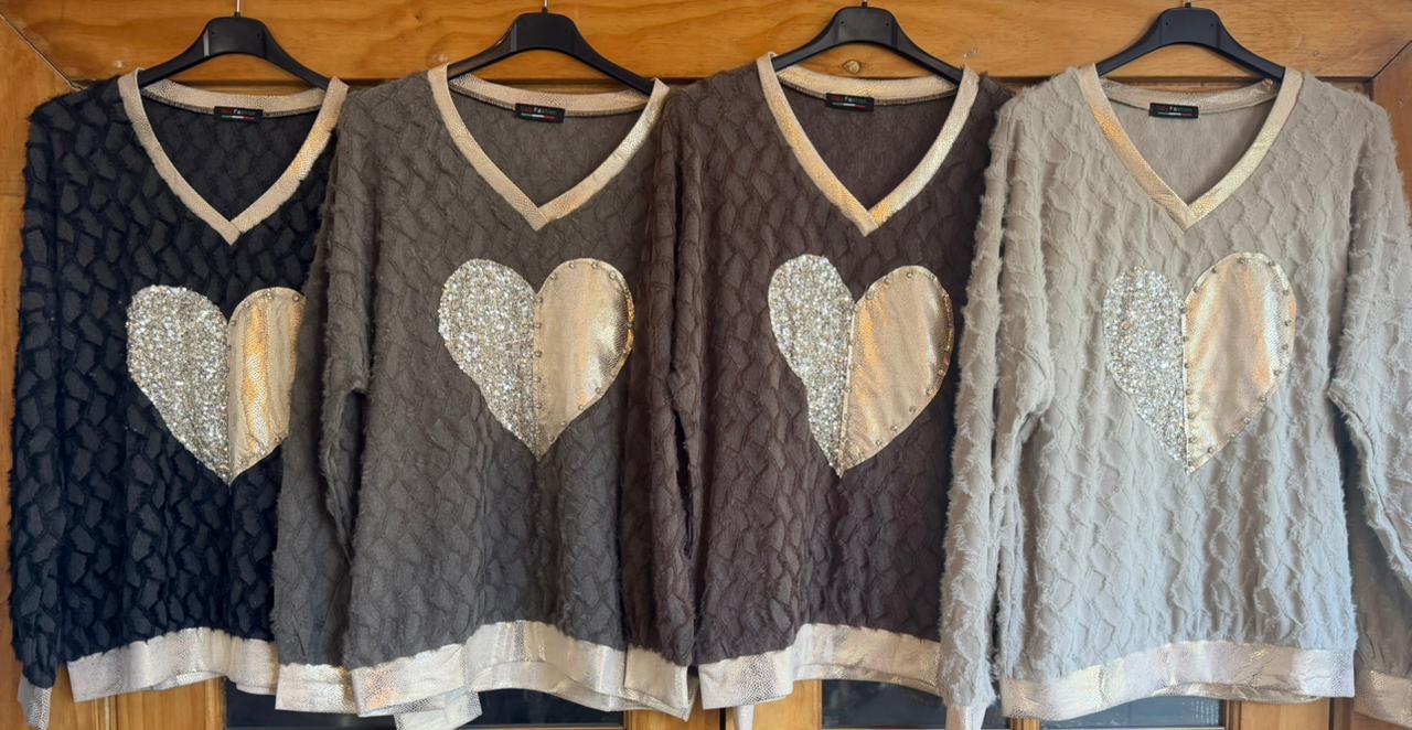 Polera algodon peludo con corazon brillante. Cuello V